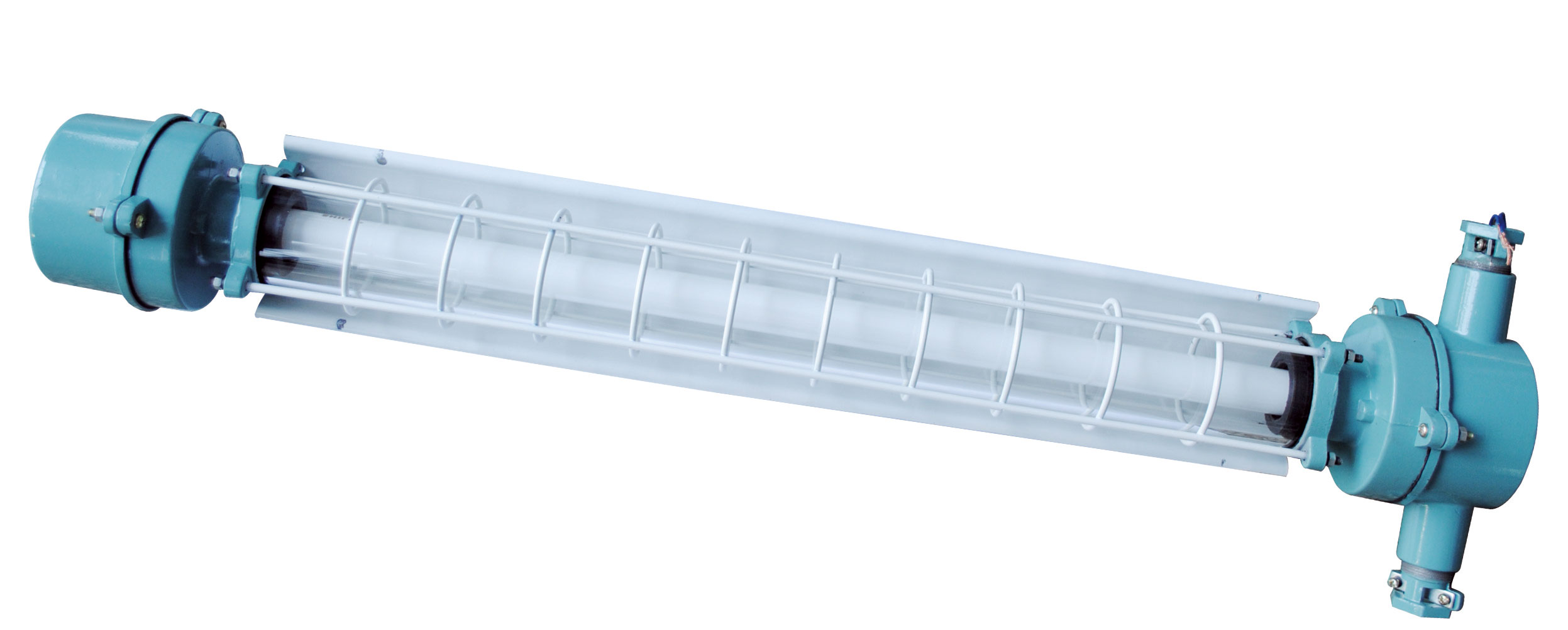熒光燈由前燈體、后燈體及光源、防爆玻璃罩、金屬防護罩等部分組成。前燈體由鋁合金外殼、蓋、啟輝器、插座等部分組成,前端蓋上設有電纜引入裝置和外接地螺釘。后燈體由鋁合金殼、蓋、鎮(zhèn)流器、插座等部分組成。光源腔與接線腔,燈具內(nèi)腔與外界均有符合規(guī)定的防爆接合面防爆。